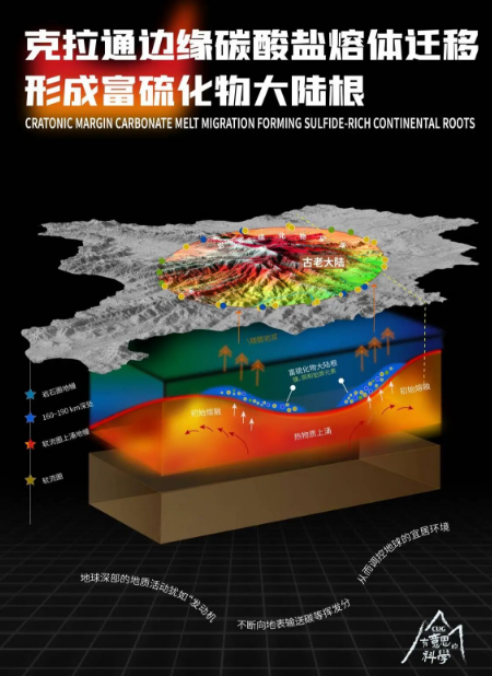 中国地质大学(武汉)陈春飞教授团队通过创新的高温高压实验模拟与大数据的统计分析,首次揭示古老大陆边缘地下160公里–190公里深处存在铜、镍、铂族金属富集层——“富硫化物大陆根”,提出碳酸岩熔体演化控制金属富集的新机制。创新性建立碳酸岩与硫化物矿床的空间耦合关系和成因联系,发现古老大陆边缘的富碳酸岩区域是关键金属(铜、镍、铂族)矿产富集地。本成果为深地成矿理论提供新视角,为我国关键金属资源勘查与保障资源安全提供重要科学依据,具有重要创新性和战略价值。成果于2025年发表在Nature上。