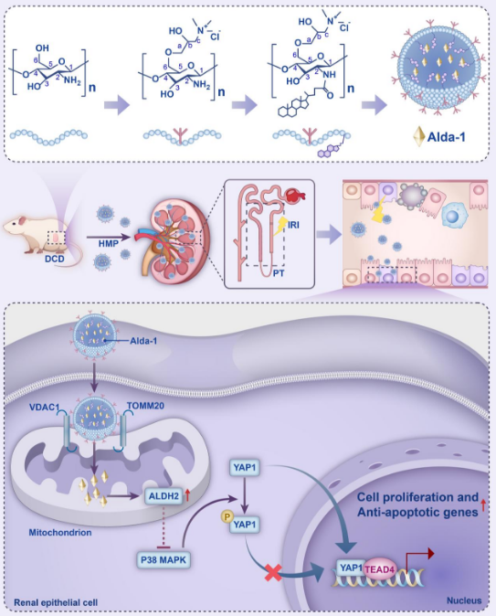 该研究创新性地将ALDH2激活剂Alda-1与两亲性壳聚糖季铵盐结合,通过胆烷酸修饰构建纳米载体,成功解决了Alda-1难溶于水的临床应用瓶颈。复合物兼具生物相容性高、药物负载率高、靶向线粒体等优势,在低温机械灌注中可稳定缓释药物。