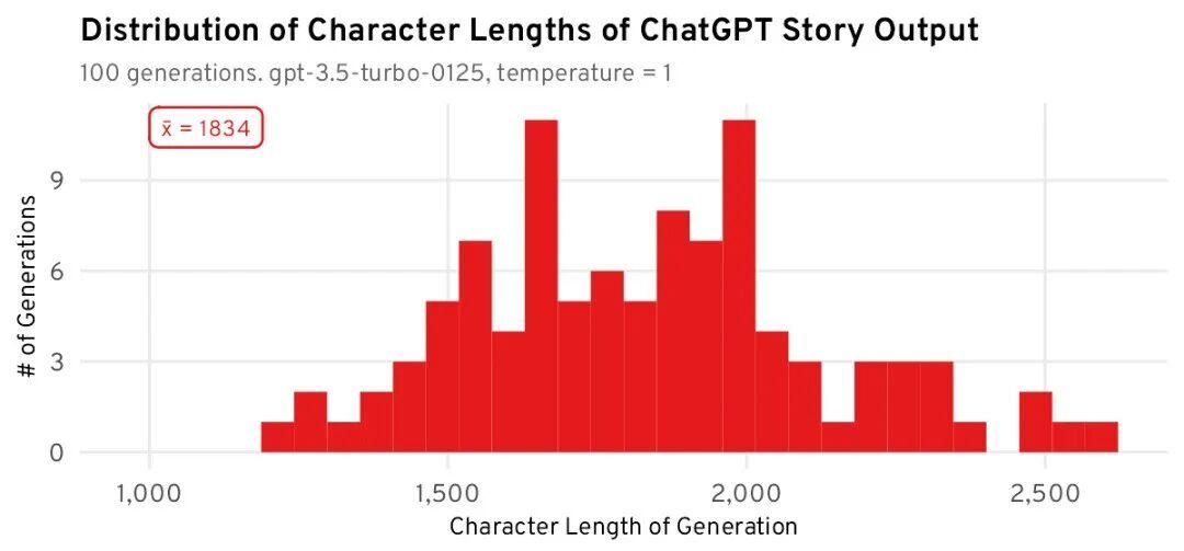 试验一共有三次,第一次是不做字数限制的情况下,AI生成的故事的平均长度为1834个字符。