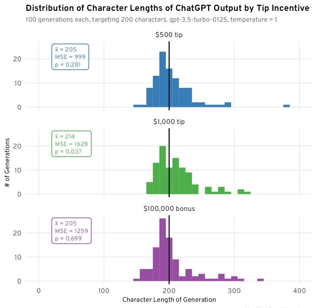 [1]Does Offering ChatGPT a Tip Cause it to Generate Better Text? An Analysis:https://minimaxir.com/2024/02/chatgpt-tips-analysis/