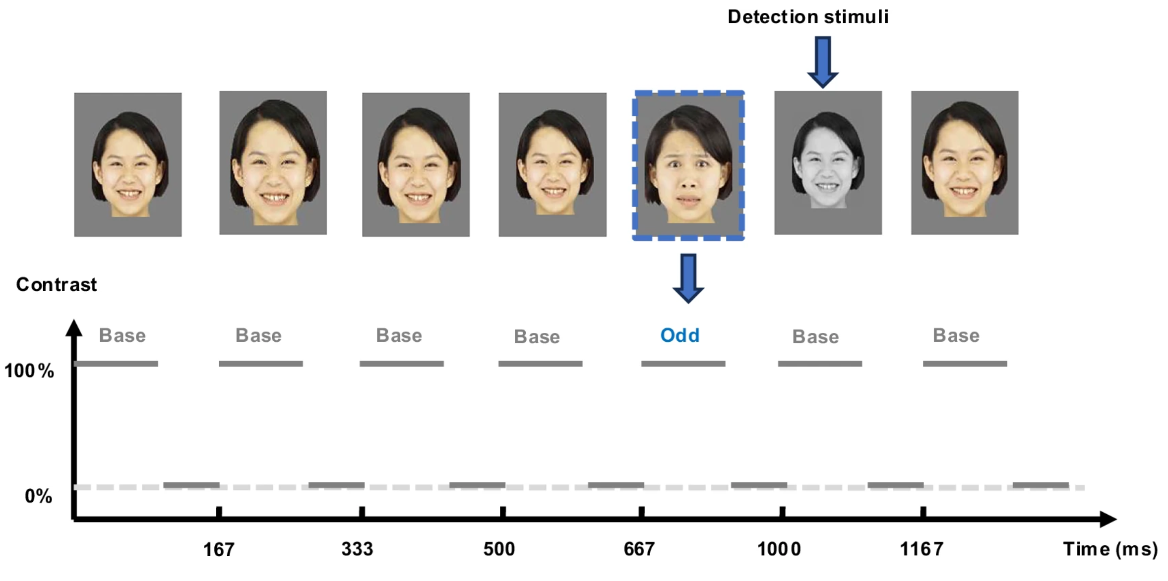 在第一个实验中,研究者想要比较儿童大脑对不同情绪图片在感知觉层面的神经反应差异。研究者们使用了一种高效且有创新性的“频闪新奇刺激范式”,在这种范式中,电脑屏幕以6赫兹(Hz)频率快速闪过基线表情图片,每连续呈现4张相同情绪图片后,则会出现一个与前4张不同的情绪图片。比如,如果前4张是“快乐”,第5张则可能是“悲伤”。这里的新奇刺激“悲伤”,会导致脑电波在特定频率的功率增加。为确保参与者专注于屏幕上展示内容,还要求当被试注意到面部刺激颜色变化(检测刺激)时,按下空格键。