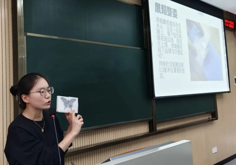 科普参观结束后,大家一同前往第一教学楼教室,开启期待已久的蝴蝶标本制作环节。活动伊始,李晨老师发表致辞,既表达了对离退休教职工重返校园的欢迎,也阐述了此次活动以自然为媒介、促进代际融合的初衷,言语中充满温情与期许。随后,讲解员李书彦详细讲解了蝴蝶标本制作的流程与技巧,从材料处理到细节固定,每一步都清晰易懂,为手工实践打下扎实基础。