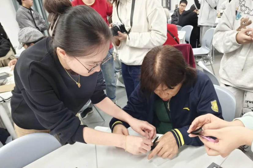 制作环节中,老教师们发挥细致耐心的优势,红杜鹃爱心社朝夕服务队的成员们也主动协助,大家分工协作、互帮互助。指尖翻飞间,一片片蝶翅被精心固定,一件件标本逐渐成型。生疏感在协作中消散,默契在交流中生长。大家专注于手中的作品,不时分享技巧、畅谈感受,教室里充满了欢声笑语。