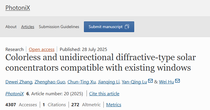 [1] Zhang, Dewei, et al. "Colorless and unidirectional diffractive-type solar concentrators compatible with existing windows."PhotoniX6.1 (2025): 20.