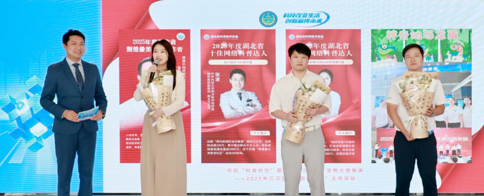 活动还对一批先进典型进行表彰。北湖街道建设社区李钟、德芭与彩虹书店曾刚、湖北地质博物馆刘鸿飞、武汉赛孚城应急安全培训中心李阳、比亚迪全品牌销售中心曹绍勇等获评首届“江小科”宣教大使;万松街道机场社区、新华街道精武社区、武汉精益眼镜有限公司、智慧武汉5G创新港科普教育基地、武汉市江汉区红领巾学校荣获“江小科”宣教团队称号;曾刚、杨盛力、刘汉生、黄玮等被推选为“江汉区网络科普达人”;何喆瑞、佘奕杉、沈则宏、王在等被授予“江小科形象大使”荣誉称号。