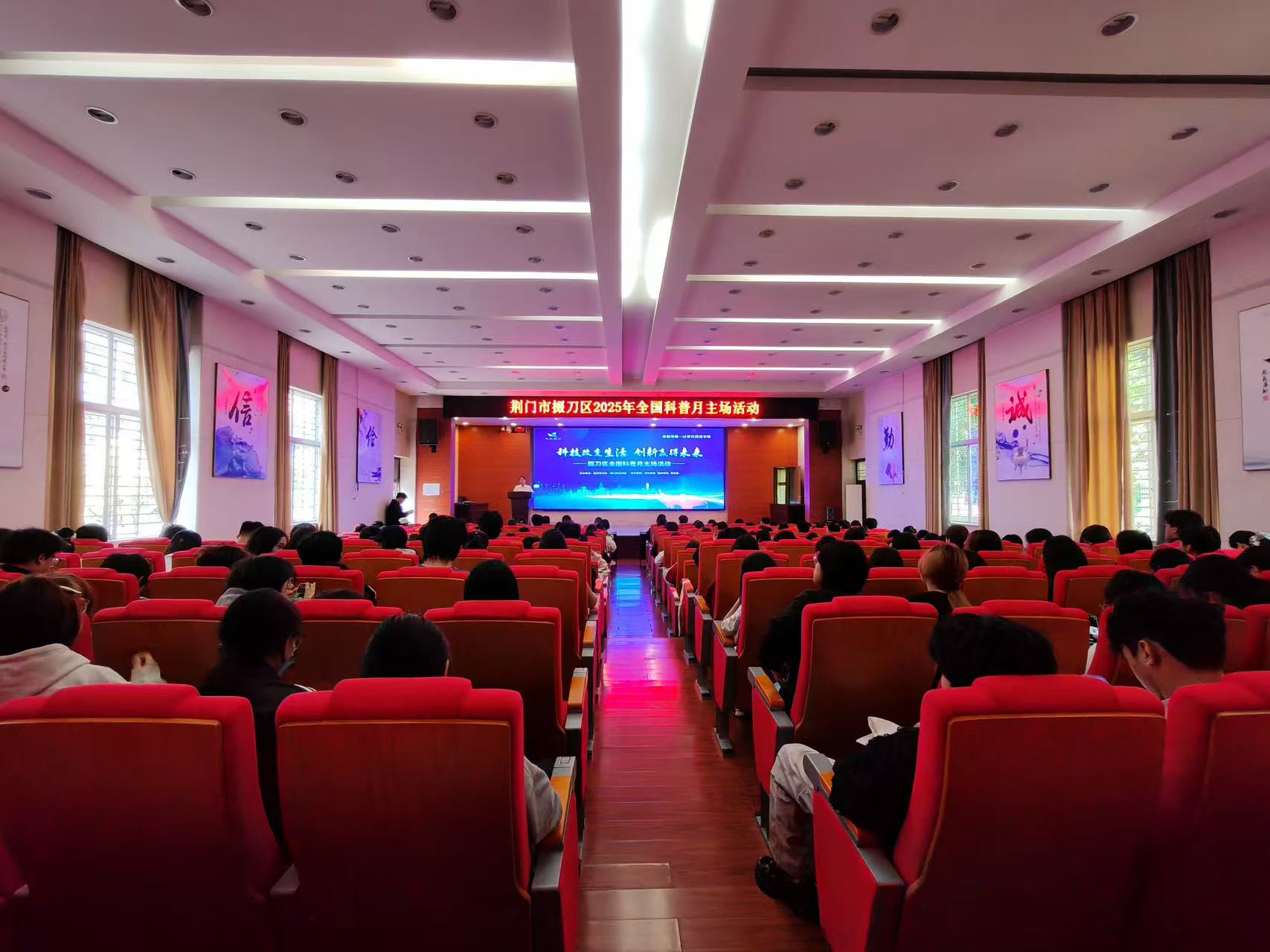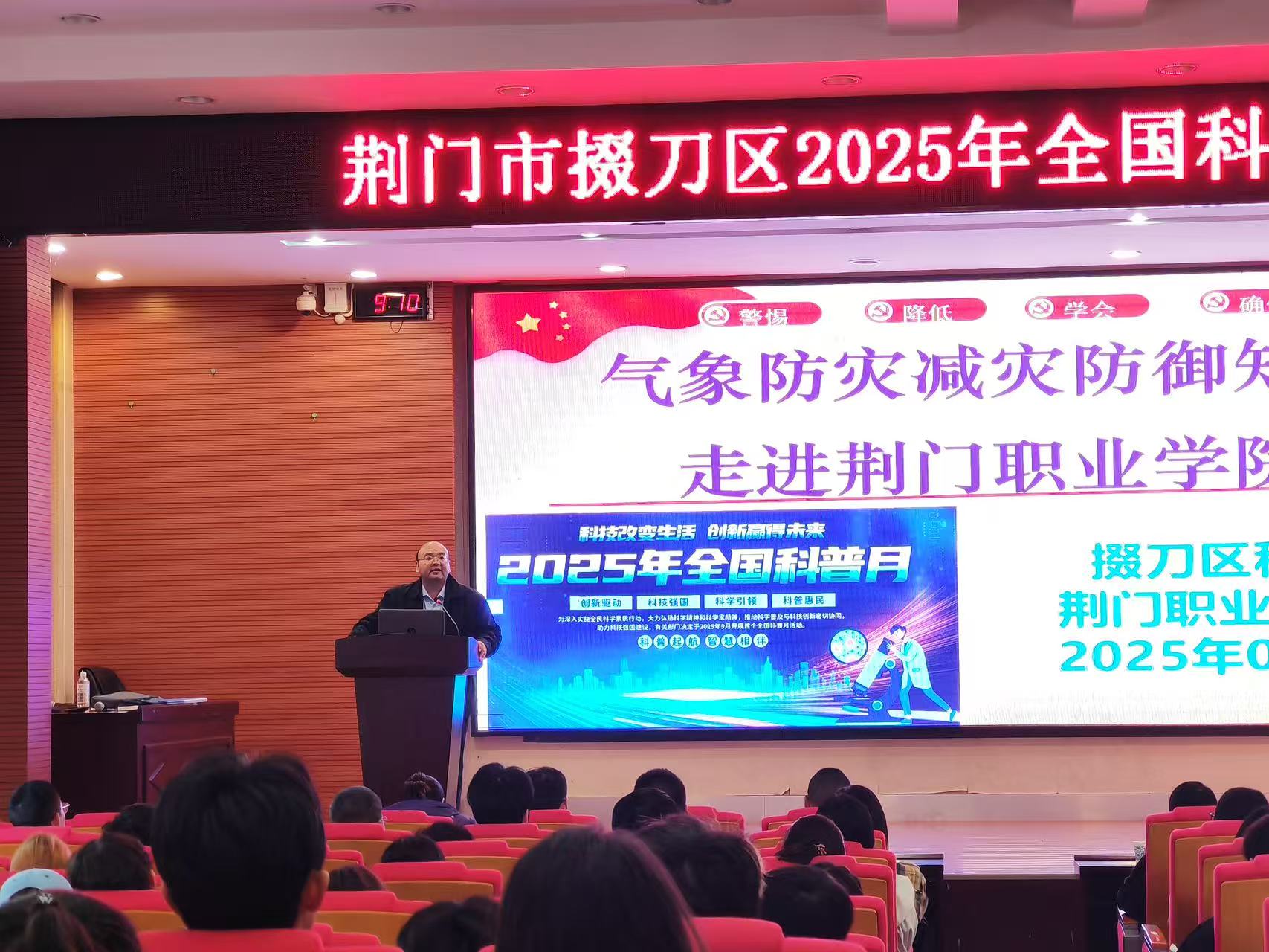 金秋九月,丹桂飘香。9月24日上午,荆门职业学院职教会堂内气氛热烈,掌声阵阵,2025年掇刀区全国科普月主场活动在此隆重举行。本次活动以“科技改变生活,创新赢得未来”为主题,由掇刀区科学技术协会与荆门职业学院联合主办,市科技馆、团林铺镇人民政府、麻城镇人民政府共同承办。荆门职业学院副校长敖小锋、财经商贸学院副院长彭静、市气象局业务管理科科长李鑫、掇刀区科学技术协会主席许曼丽、区农业农村局党组成员钱磊明出席主场活动,区各乡镇科技干事以及荆门职业学院的200名师生参加活动。
