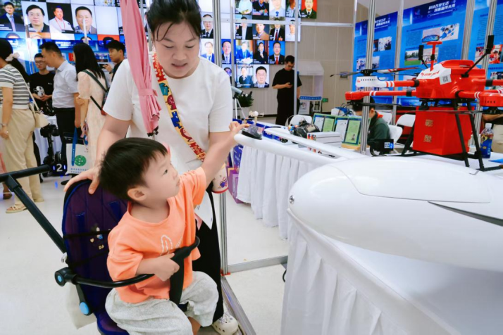 在湖北时代星光科技有限公司(以下简称“时代星光”)的展台前,一位小朋友好奇地指着展台上的无人机。