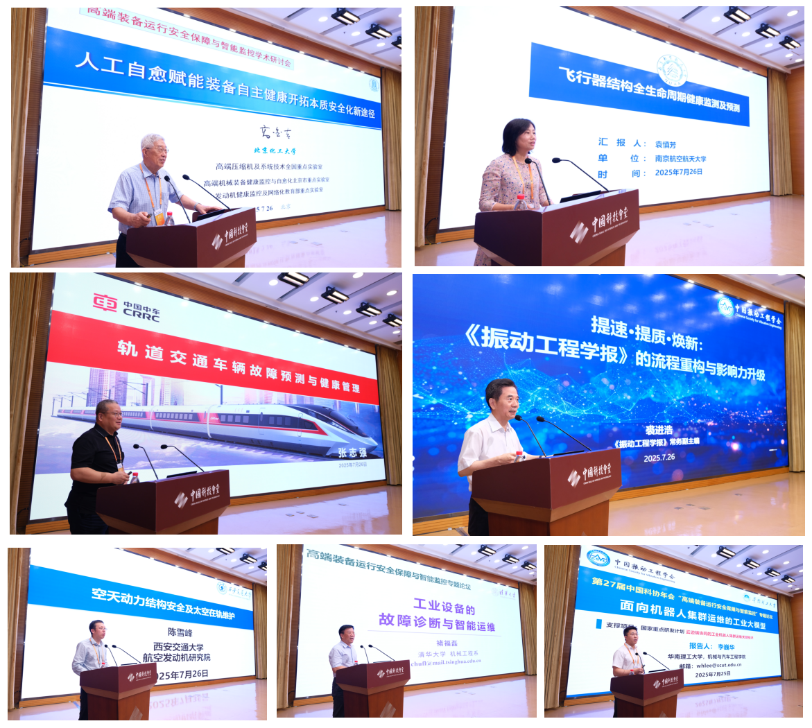 大会邀请报告由陈雪峰教授和张方教授主持。高金吉院士、南京航空航天大学袁慎芳教授、中车青岛四方机车车辆股份有限公司张志强副主任、陈雪峰教授、清华大学褚福磊教授、华南理工大学李巍华教授、南京航空航天大学裘进浩教授分别作题为《人工自愈赋能装备自主健康开拓本质安全化新途径》《飞行器结构全生命周期健康检测及预测》《轨道交通车辆故障预测与健康管理》《空天动力结构安全及太空在轨维护》《工业设备的故障诊断与智能运维》《面向工业机器人集群运维的工业大模型》《提速·提质·焕新:<振动工程学报>的流程重构与影响力升级》的报告。
